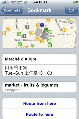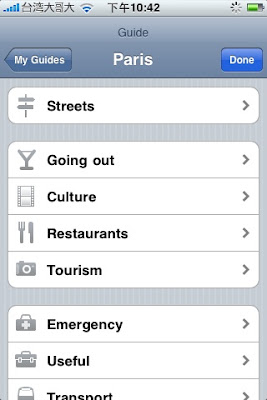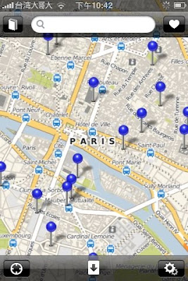巴黎地區的旅遊資訊豐富、圖資處理快速、可自訂景點、離線瀏覽是這個軟體的優點(同樣是離線地圖的Paris 2 go圖資處理速度很慢),她有全世界4500個包含台北、高雄在內的城市圖資可以免費下載到手機裡,各城市景點/餐廳/公共設施可供搜索的指南需要另外購買(付費版內含2次的指南下載),這軟體我是這樣使用的: