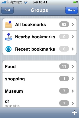 2.設完Bookmark之後,還有一項重要工作就是決定路線,我的方法是將Bookmark分類:博物館、餐廳、小吃、購物、景點…;再將各個在地圖上臨近的Bookmark依行程歸類(例:第一天行程歸到D1,第二天D2…),歸類好了,你的每日行程也排好了,看著地圖順著遠近距離,依續走完就行了。